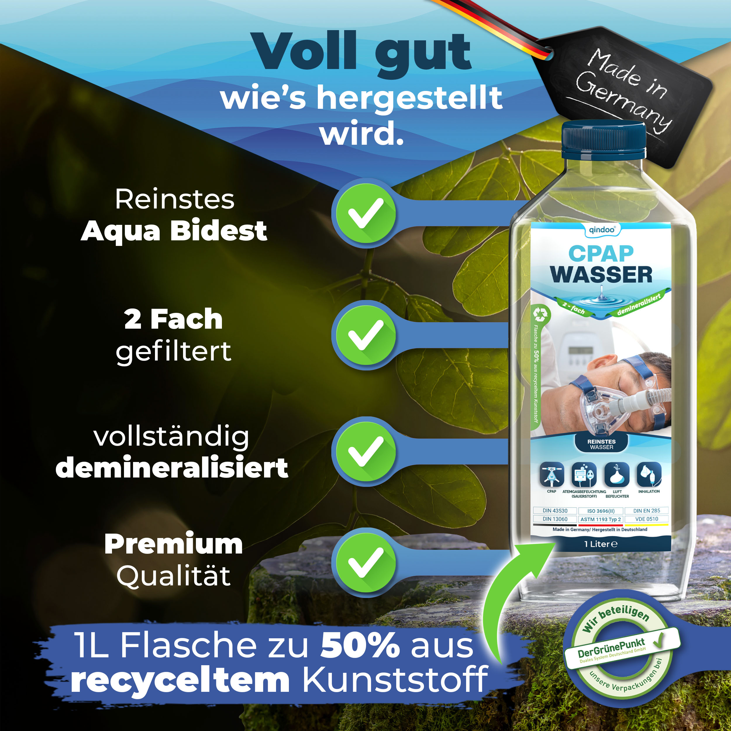 CPAP Wasser. Reines 2-fache Bi destilliertes Wasser für die Atemgasbefeuchtung.